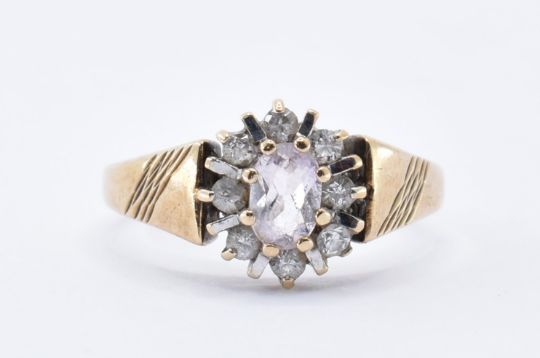 A hallmarked 9ct gold cluster ring having a central oval cut faceted white stone surrounded by a halo of eight smaller white stones in claw settings and engraved decoration to the shoulders. Hallmarked for Birmingham. Ring size N. Total weight 2.3g