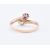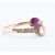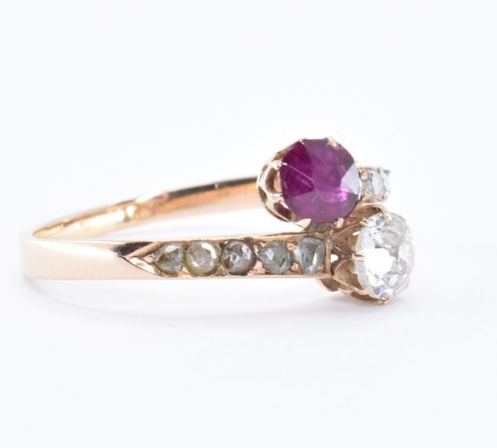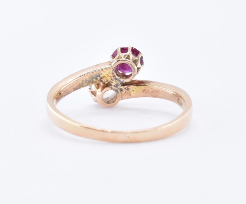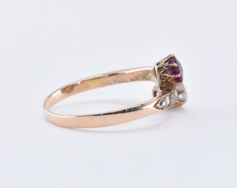 A gold diamond and ruby crossover ring being set with two around cut diamond and round cut ruby with further round cut diamond accent stones to the shoulders. Diamond measures approx 4.5mm, ruby measures approx 4.5mm. Weight 1.9g. Size L.5. Tests indicate 14ct gold.