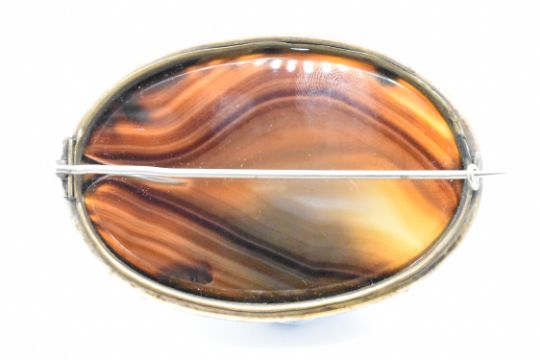 A group of jewellery to include a large yellow metal agate set brooch of oval form, a gold plated fob seal set with a bloodstone panel, a yellow metal swivel fob pocket watch key set with a bloodstone panel (unmarked, tests indicate 14ct gold, weight 5.8g) and a hallmarked 9ct gold toothpick (hallmarked Birmingham 1968, weight 3.0g). All housed within a tooled leather jewellery box set with a pietra dura floral stone panel to the lid.