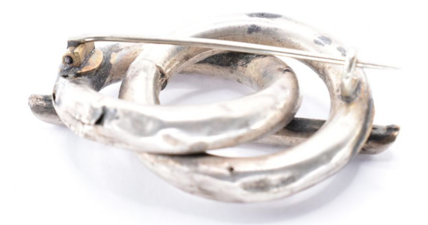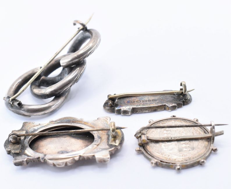 A collection of Victorian silver jewellery. The collection to include a hallmarked Victorian brooch (4.3cm) and earring parure,  hallmarked 1880 Birmingham Sponsor JW.  A hallmarked double horseshoe / S brooch hallmarked 1893 (3.5cm) sponsor B&M. Two white metal knot brooches one set with agate longest approx 5cm. A brooch mounted Victorian silver shilling 1887. Total weight 41g.
