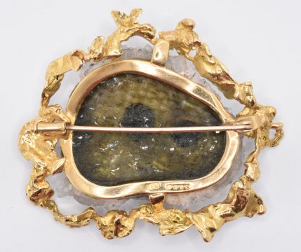 A retro 1960's John Donald 18ct gold geode brooch having a central crystallised stone set within a gold nugget flake openwork mount, having a hinge pin with barrel clasp to the verso Hallmarked London 1960 with makers mark JAD, complete with original John Donald box. Measures approx 5.3cm wide. Weight 25.5g. Good condition.