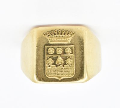 A French 18ct gold signet ring having a square head with engraved crest to the head. French owl mark to the band. Weight 14.0g. Size R.
