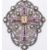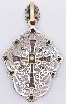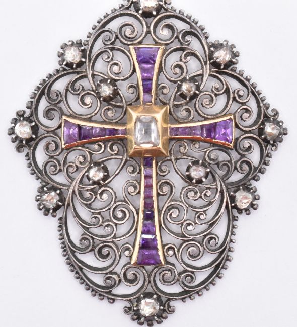 A 19th Century crucifix pendant having a central table cut diamond within a cross of flat cut amethysts set within a scrolled silver open work mount set with old cut diamond accent stones, having a further table cut diamond to the bale. Lozenge mark to the bale with makers marks ET. Measures 6.2cm. Weight 10.9g.