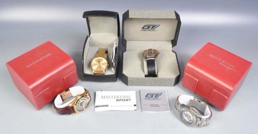 A group of four wrist watches to include a Mastertime Sport water resistant watch, a Mastertime automatic wrist watch, a Christin Lars watch, a GT precision water resistant watch, all in fitted boxes.