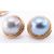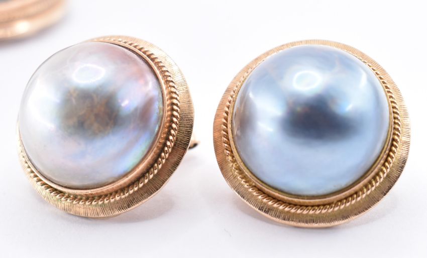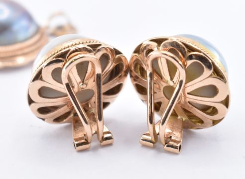 A 14ct gold and half pearl demi parure jewellery suite to include a ring, pair of clip on earrings and a pendant each being set with ' blue ' half pearls with rope twist borders. AF clip to one earring needs re soldering. All marked 14k. Weight 30.3g. Ring size T.5. Largest pearl approx 17mm diameter.