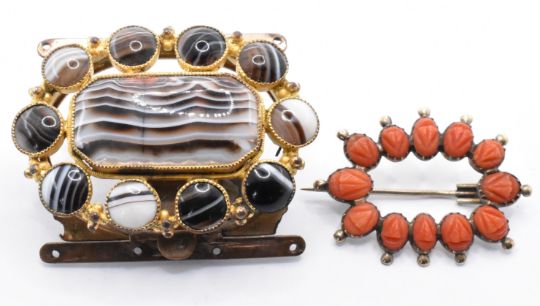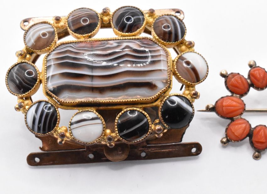 A 19th Century Victorian agate set necklace clasp having a large central rectangular panel surrounded by ten round agate cabochons on a gold plated tongue groove clasp (measures 4.8cm). Together with a Victorian brooch set with twelve carved coral stones and hinge pin verso (measures 3.6cm wide).
