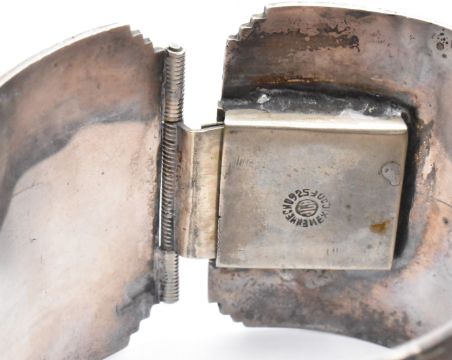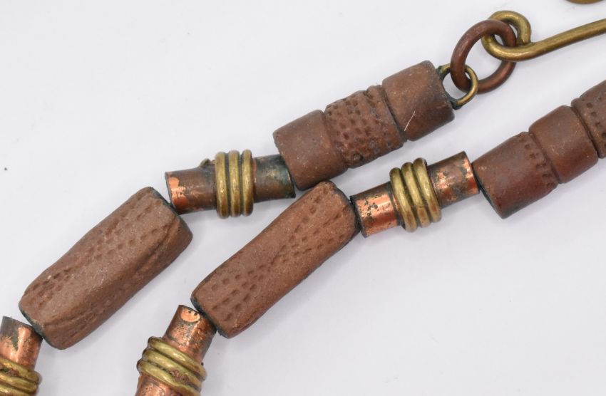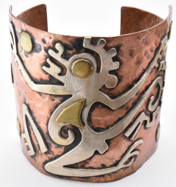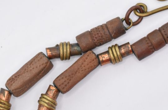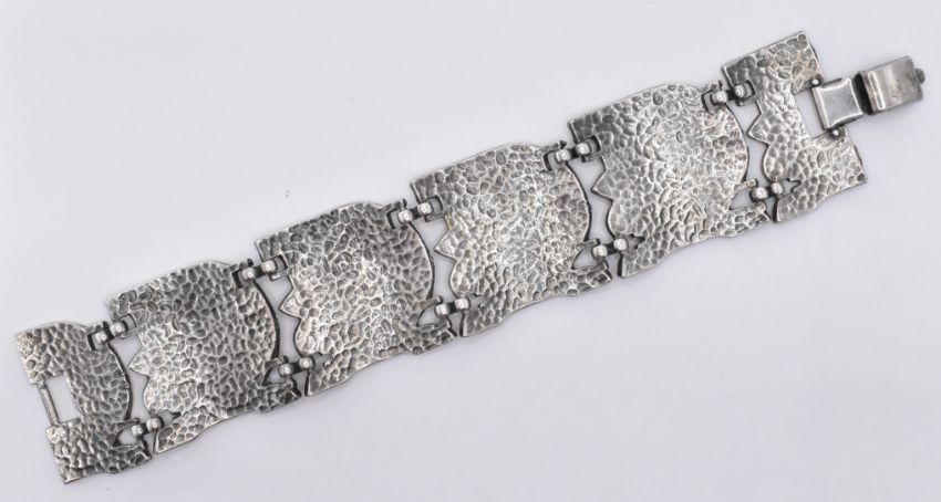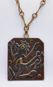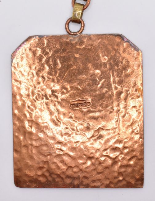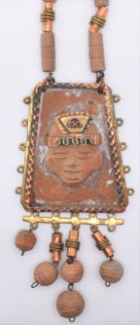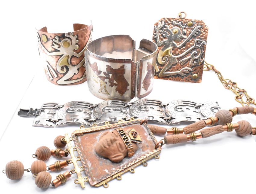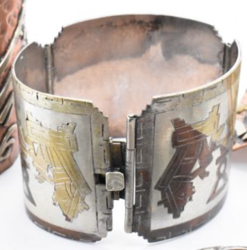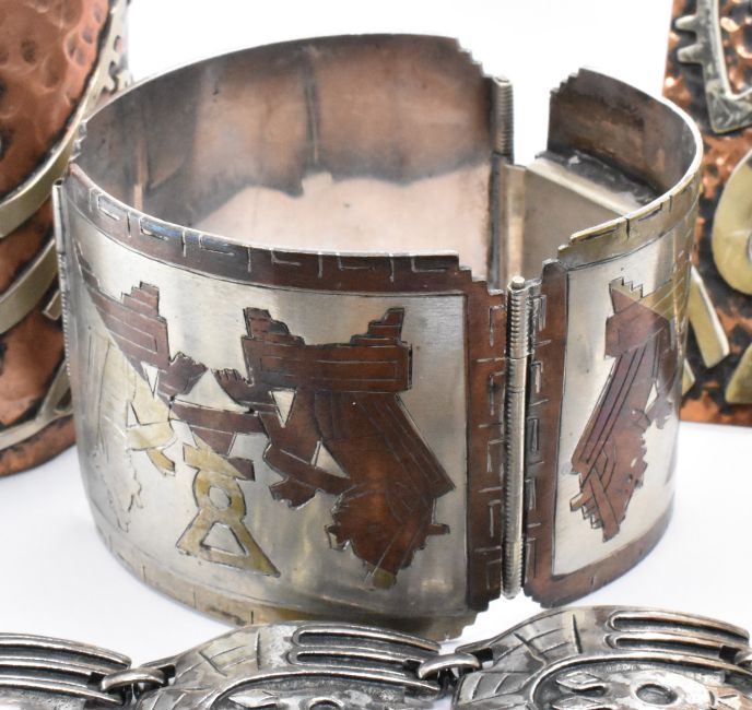A group of Mexican jewellery to include a silver panel bracelet with contrasting copper and brass stylised motif's (marked EN Hecho Mexico 925), a hammered tri metal bangle and matching necklace (marked Mexico), a white metal panel bracelet and a face mask amulet necklace with ceramic beads.