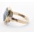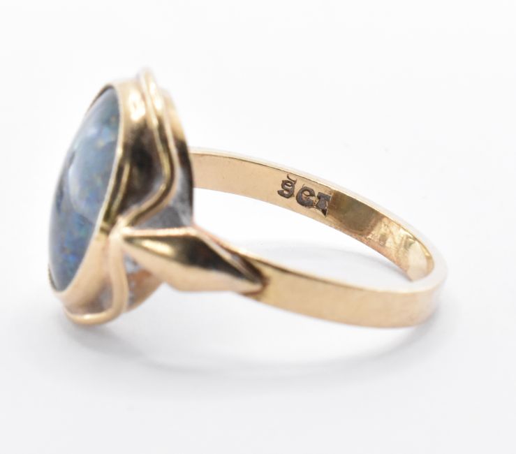 A 9ct gold ring bezel set with a central oval faux opal blue stone panel together with a pair of yellow metal and faux opal stud earrings. Ring stamped 9ct, weight 3.1g, size N.