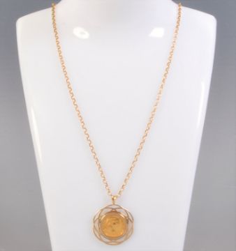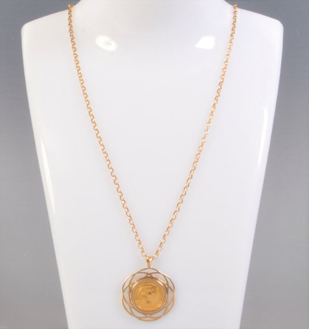 A 9ct gold belcher link necklace chain and pendant set with a 1984 1/10 oz krugerrand coin set within the pendant. Chain marked 375 with London Import marks. Chain measures 20 inches. Weight 9.6g.