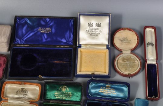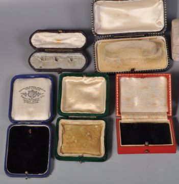 A group of 19th Century and later jewellery boxes to include a selection of shapes and sizes to include tooled leather examples. Jewellers to include Clerc Paris, H T Lamb, S J Phillips, Alldis & Co, Elkington & Co etc.