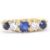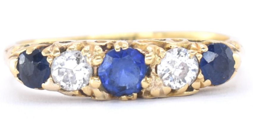 An 18ct gold sapphire and diamond ring. The ring set with three mixed cut sapphires and two old cut diamonds in a gypsy setting. Marked 18ct. Weight 4.15g. Size R.