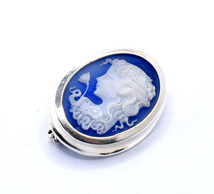 A stamped 925 silver cameo style brooch in the manner of Wedgwood being set within a silver mount and having a carved profile of a maiden with a single rose. Total weight 4.60g.