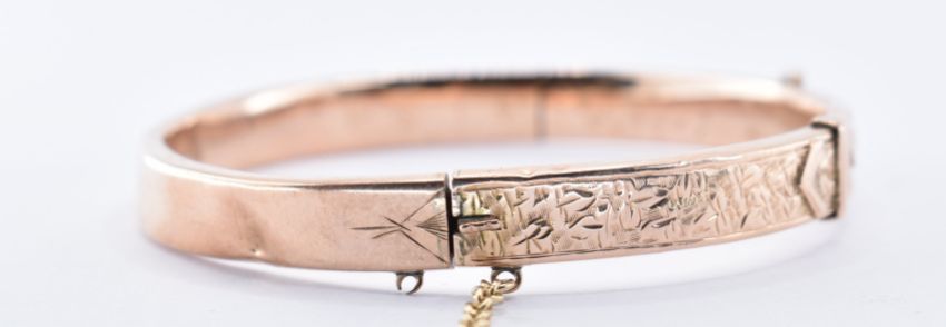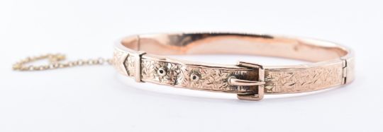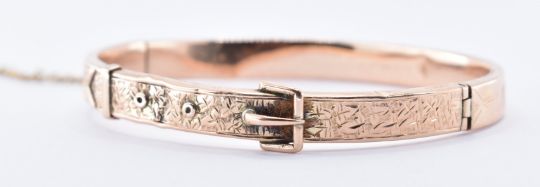 A late 19th century buckle bangle bracelet. The band having a buckle motif with etched decoration and snap clasp fastener. hallmarked Birmingham mark worn. Weight 7.7g. Measures internal circumference 16cm.