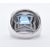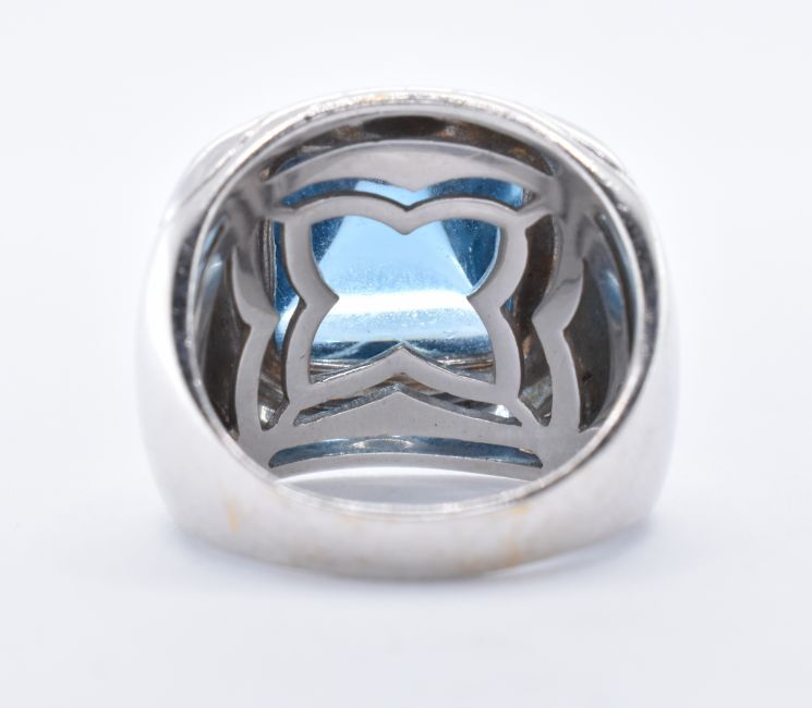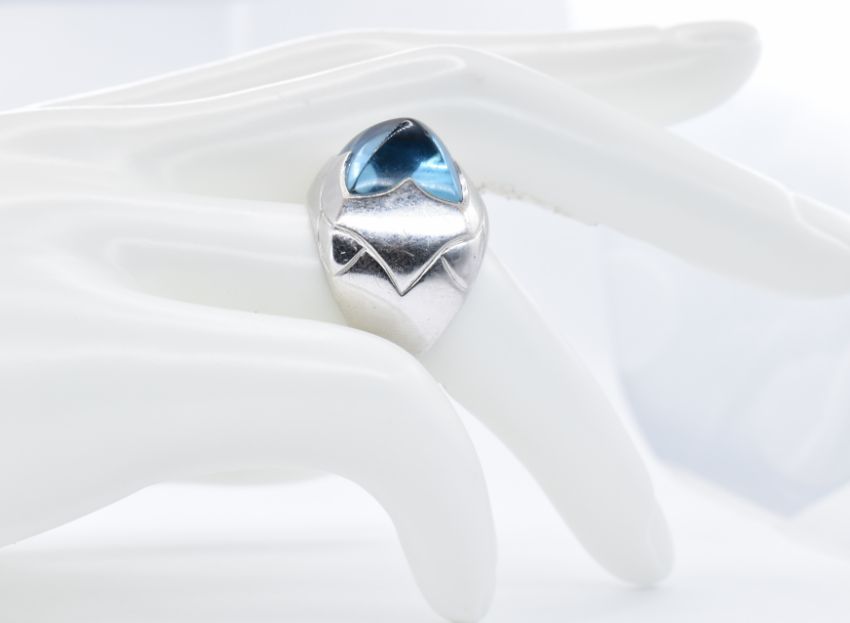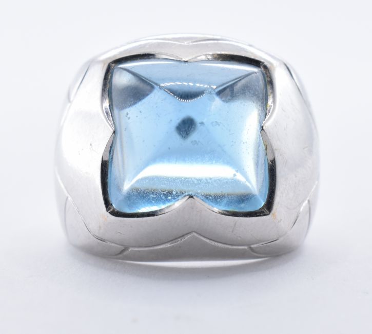 An 18ct white gold Bulgari blue topaz 'Pyramid' ring. The ring set with a pyramid cut sugarloaf cabochon within a stylised bezel mount to wide tapering plain shank. Signed Bulgari 750 Italian Mark. With Original box - hinge broken. Topaz approx 12mm x12mm x 7.7mm. Weight 16.17g. Size M.