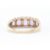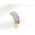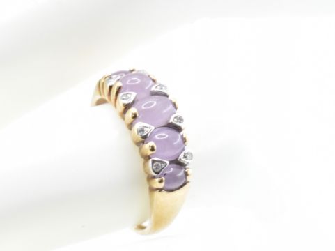 A stamped 9ct gold ring having a row of five amethyst cabochons having eight diamonds. Stamped 375 and hallmarked for Sheffield. Size M. Total weight 2.6g.