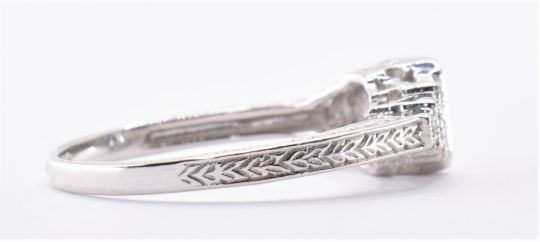 An 18ct white gold aquamarine and diamond ring having a rectangular cut aquamarine to the centre having stepped shoulders set with diamond accent stones. Weight 2.8g. Size N. marked 750.