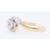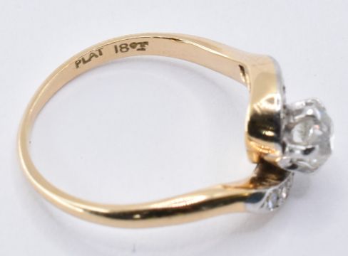 An 18ct gold and platinum diamond crossover ring set with a central round cut diamond with six further round cut diamonds to the shoulders. Marked 18ct & plat to the band. Weight 2.6g. Size K. Principle diamond measures approx 4.4mm diameter.