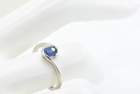 A hallmarked 9ct white gold crossover ring being set with an oval cut sapphire. Hallmarked Birmingham 2006. Weight 2.0g. Size N.