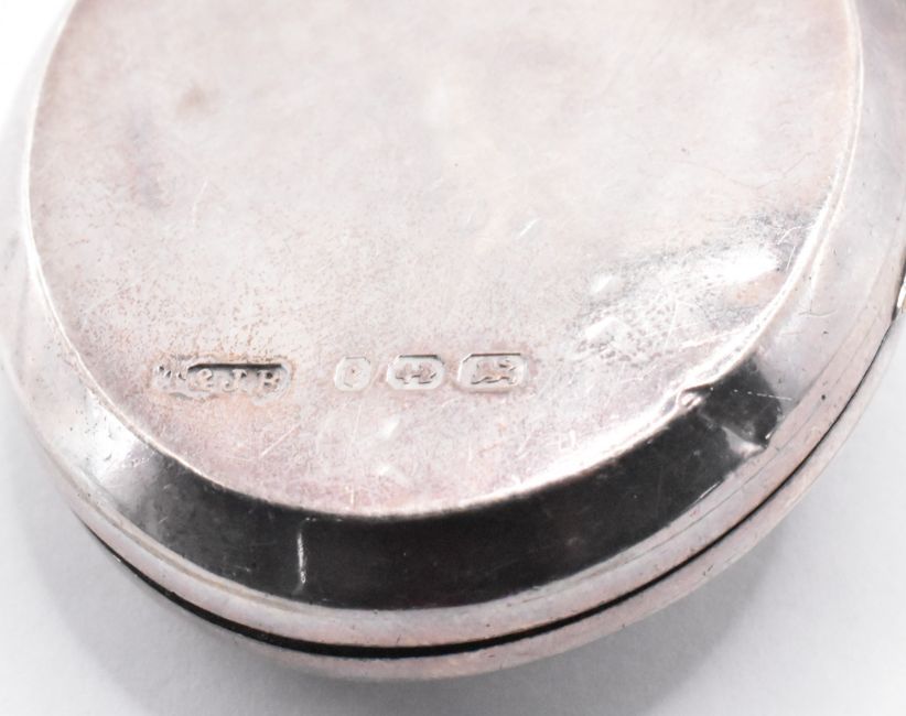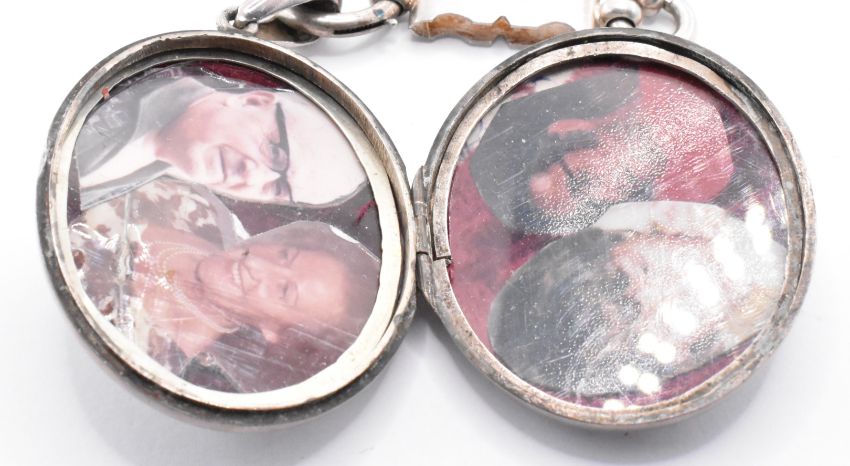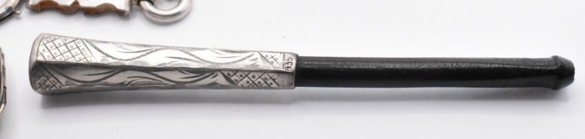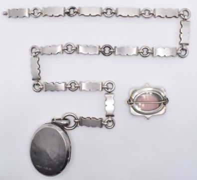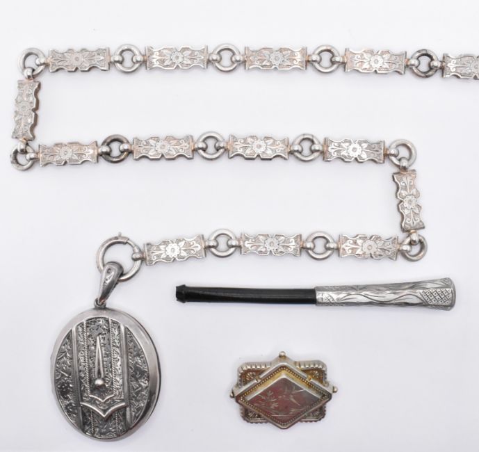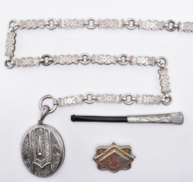 A group of 19th Century Victorian silver jewellery to include an oval locket with moulded and engraved decoration to the front on a book chain necklace with spring ring clasp (hallmarked Birmingham 1879, chain unmarked), a silver mourning brooch with engraved bird decoration and glazed panel to the verso (marked sterling), a silver and ebonised wooden cheroot holder (marked 835). Weight of locket and brooch 57.3g.