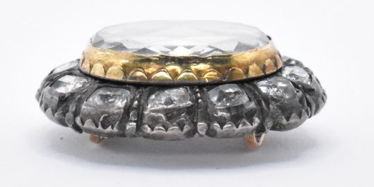 An 18th Century Sturt crystal mourning slide having a central oval panel with woven hair work beneath a faceted crystal panel with a halo of flat cut paste stones having enamelled detailing to the verso. Measures 2.5cm wide.