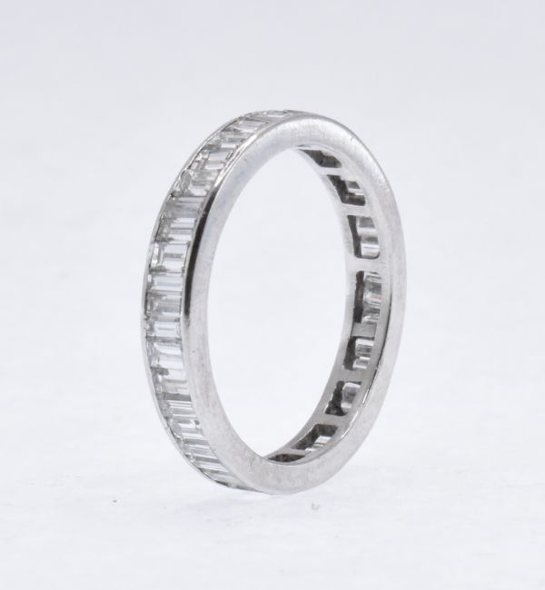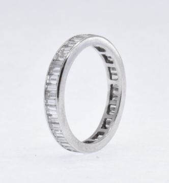A French platinum and diamond eternity ring being set with baguette cut diamonds throughout. Total estimated diamonds 2ct. Mascaron mark to the band. Weight 4.12g. Size R.5.