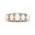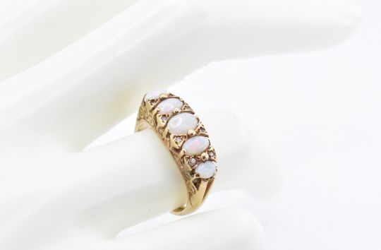 A stamped 9ct gold ring having five graduating opal cabochons and eight diamonds in between with scroll decoration to the shoulders. Hallmarked for Birmingham. Size M.5. Total weight 4.7g