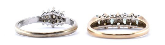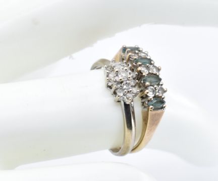 A pair of hallmarked 9ct gold rings to include a half eternity ring set with CZ's and faceted green stones, hallmarked for Birmingham. Together with a 9ct white gold cluster ring set with fifteen white stones Sizes M & L. Total weight 3.8g.
