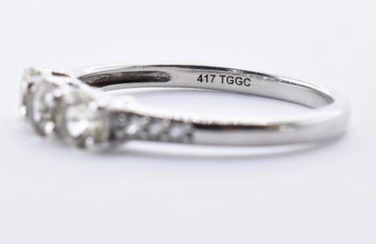 A hallmarked 9ct white gold ring set with three round cut green stones flanked by three round cut white accent stones. Hallmarked Birmingham 2014. Weight 2.3g. Size P.5. Good condition.