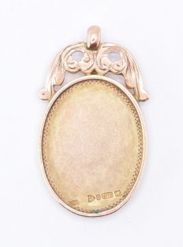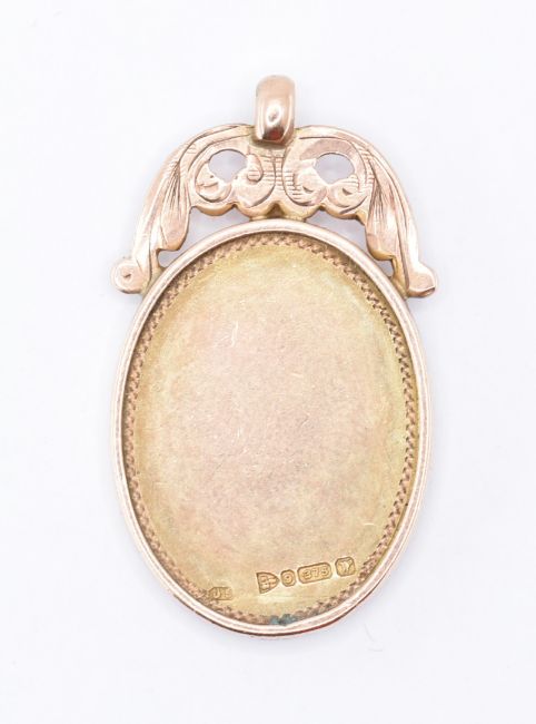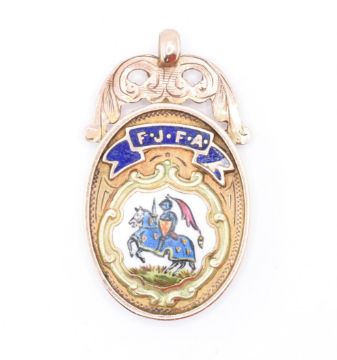 An early 20th century 9ct gold and enamel pendent of an oval form with pierced foliate decoration to the top, enamel plaque to the front depicting a cavalier on a horse with F.J.F.A insertion atop on a blue enamel ribbon. Chester hallmarks dated 1922 and 9 - 375 impressed marks. Measures: 3.5cm long x 2cm wide. Weight: 7.5g