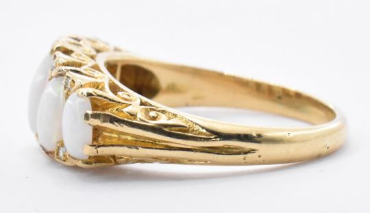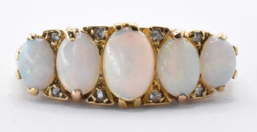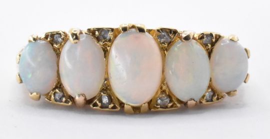A hallmarked 18ct gold ring being set with five graduating opal cabochons with diamond accent stones to the head. Hallmarked London 1968. Weight 6.6g. Size O. Largest opal approx measures 7.3mm.