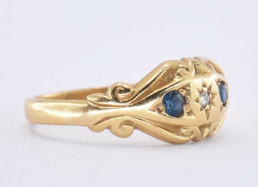 An 18ct gold sapphire and diamond ring. the ring set with a central rose cut diamond  flanked by two mixed cut sapphires. Marked 18ct 399. Weight 2.85g. Size M.