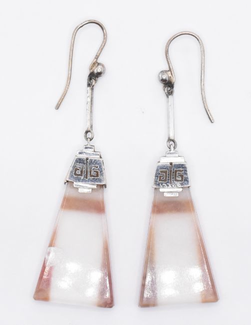 A pair of 1930's Art Deco white gold and hard stone stone panel earrings of triangular form having geometric red and white stone panelled drops with white gold mounts having pierced key design. Tests indicate 9ct gold. Measures 5.5cm including hook. Some chips to the stone on the verso.