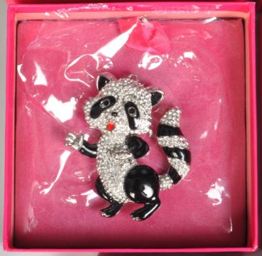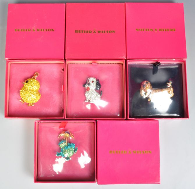A group of three Butler and Wilson crystal set jewellery to include a large pendant in the form of a raccoon with black enamel detailing, an articulated racoon brooch and a panda bear pendant necklace. All in original boxes. Large racoon measures 6.5cm high.