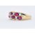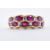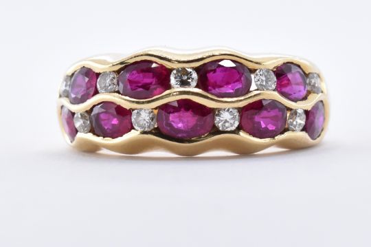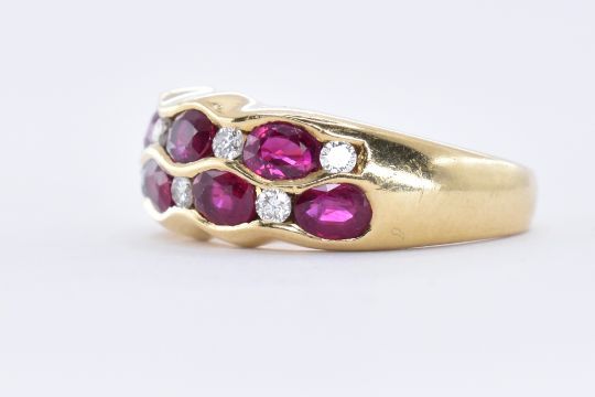 A hallmarked 18ct gold and ruby and diamond band ring. The ring having 9 oval mixed cut rubies and 9 round brilliant cut diamonds within a scalloped wide band setting.  Estimated diamond weight 0.18ct. Rubies measure approx 4mm x 3mm. Hallmarked London. Sponsor SJL. Weight 6.58g.