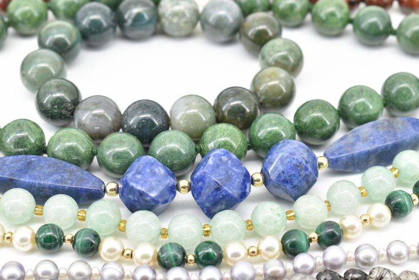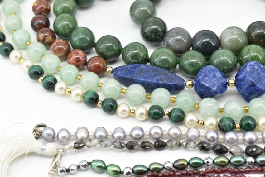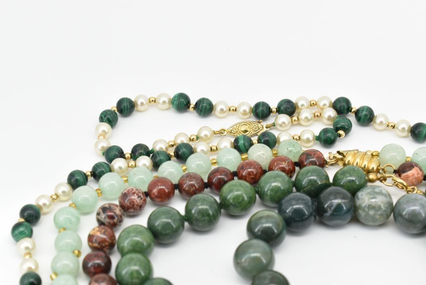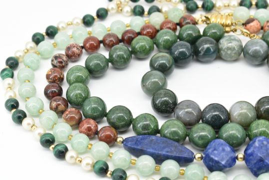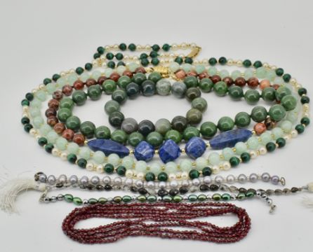 A selection of necklaces and bracelets strung with, lapis lazuli, garnet, malachite, cultured and simulated pearls, quartz . Measures longest 104cm, shortest 18cm.