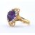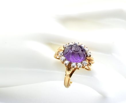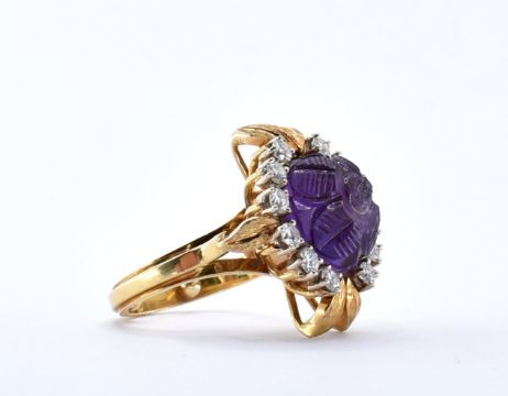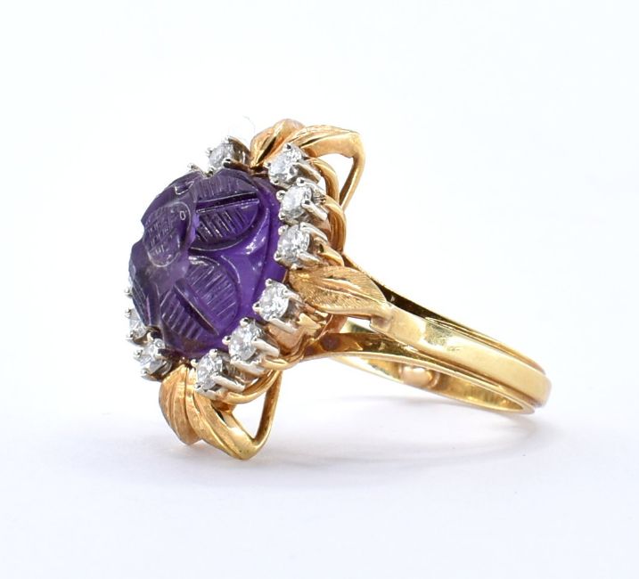 A stamped 18ct gold amethyst and diamond cocktail ring set with a large round central amethyst carved with a flower design surrounded with twelve round cut diamonds and moulded foliate details interior of the band marked 18ct. Resizing balls to the interior of the band. Amethyst measures approx 11mm diameter.