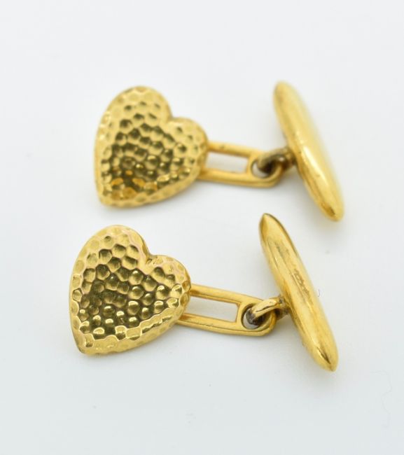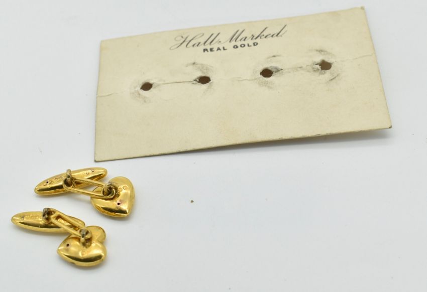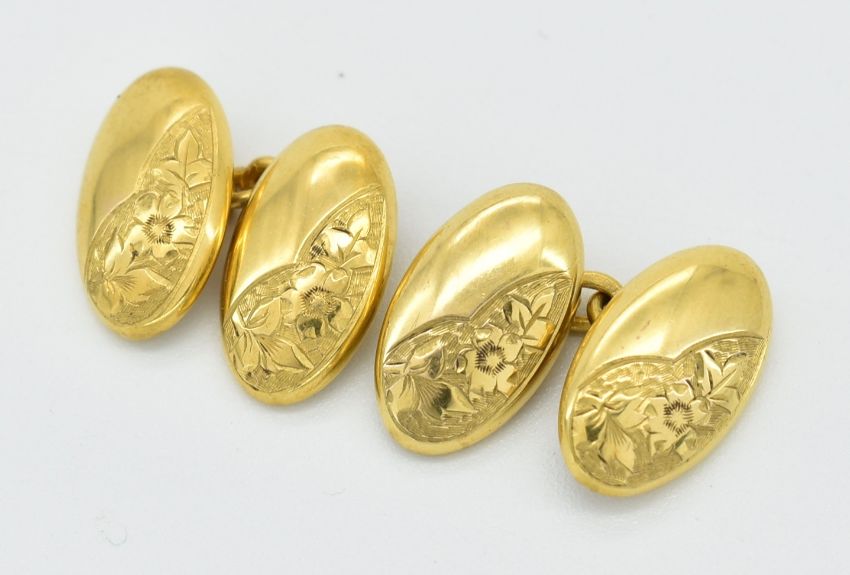 Two pairs of hallmarked 9ct gold cufflinks to include a pair of oval heads having floral engraving (hallmarked Chester 1896) and a pair having heart shaped heads with toggle backs (hallmarked Birmingham 1892) Total weight 5.1g.