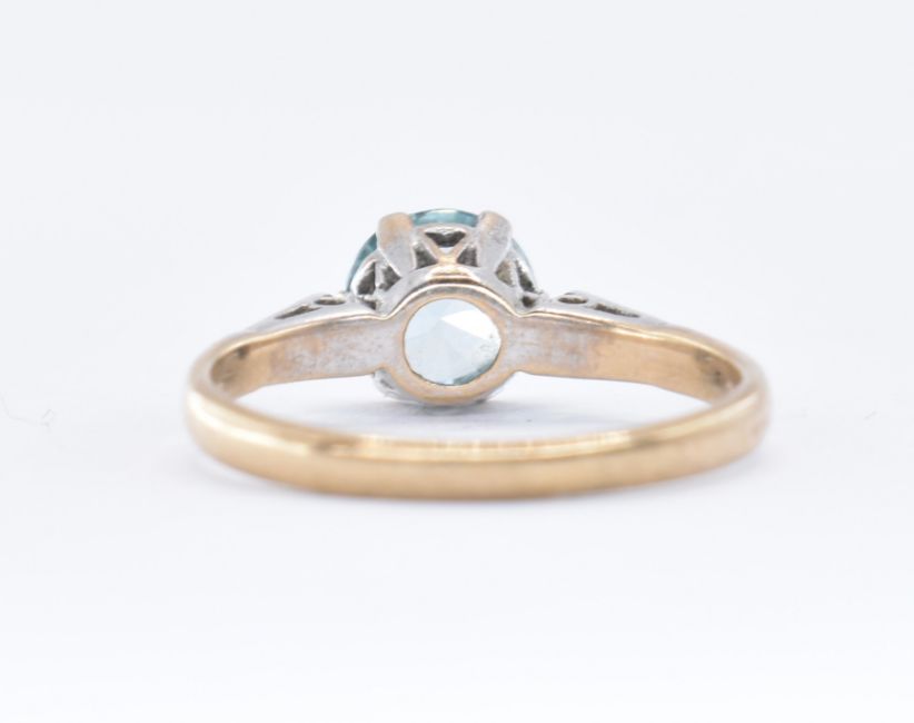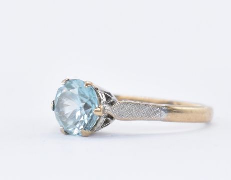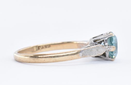Two 9ct gold rings to include a blue stone solitaire ring having textured white metal shoulders (assay marked London, size k) together with a hallmarked white stone ring bezel set with a square cut purple stone (hallmarked Birmingham 2006, size N.5). Total weight 4.4g.
