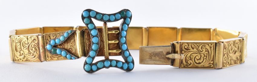 A 19th Century Victorian gold bracelet having 14 gold panels each being engraved with foliate scrolls, having a buckle to the front set with round turquoise cabochons with a tongue in groove clasp. Unmarked tests indicate gold. Measures 17.5cm. Weight 16.3g.
