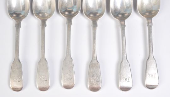 A set of six 19th Century silver hallmarked fiddle pattern spoons each having engraved initials to the terminals. All hallmarked London 1839, makers marked for Mary Chawner. Weight 182.7g.