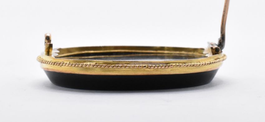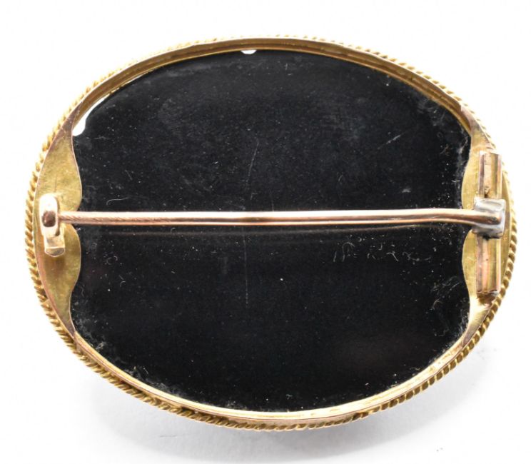A 19th Century Victorian micro mosaic brooch of oval form an having a central onyx panel with inlaid coloured stones depicting the doves of Pliny, within a yellow metal mount with hinge pin to verso. Measures 4.3cm wide. Set within a Austin & Williams box.