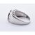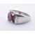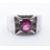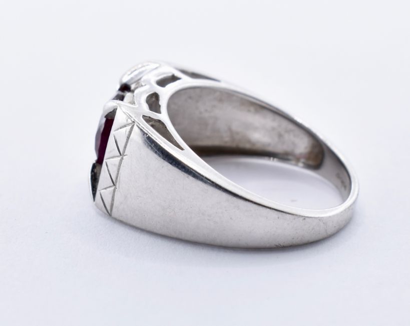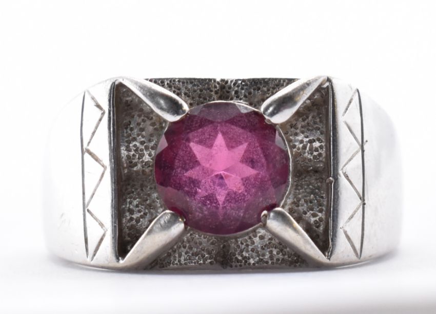 A hallmarked white gold ring being set with a round cut pink stone within a square head with geometric engraving to the shoulders. Hallmarked Birmingham 2006. Weight 5.9g. Size O.