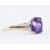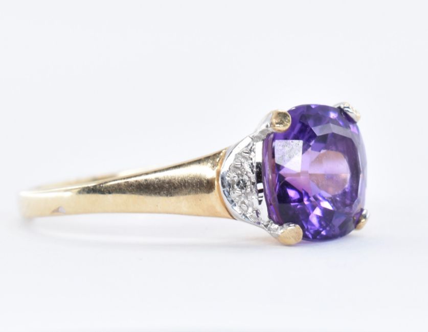 A hallmarked 9ct gold having a faceted purple stone flanked by two illusion set diamonds. Stamped 375. Hallmarked for London Size L.5 / M. Total weight 2.1g.