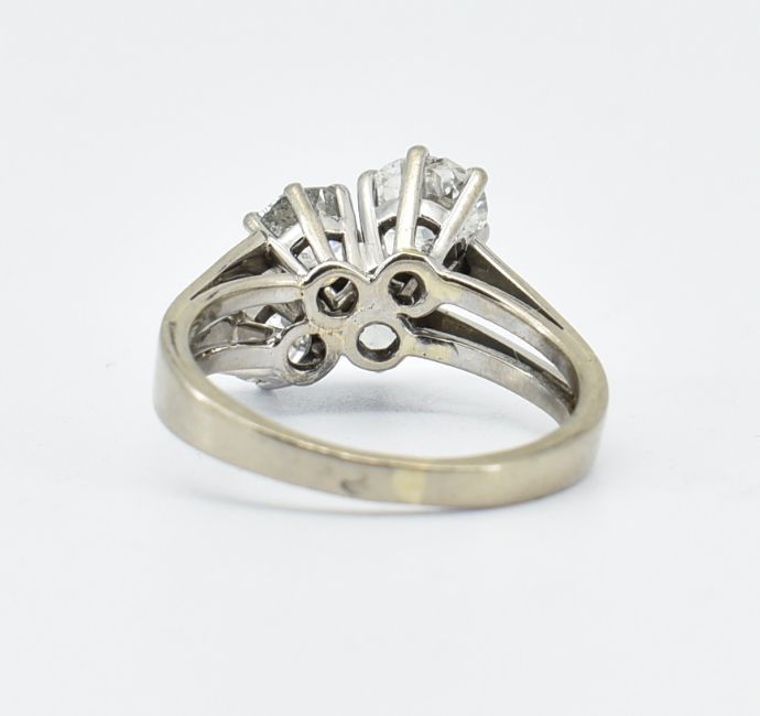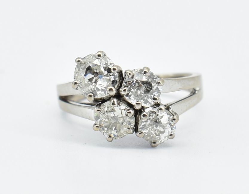 A French 18ct white gold and diamond four stone ring having split shoulders being set with four round cut diamonds. French eagle mark to the back of the band. Weight 5.7g. Size N.5. Estimated diamond weight total 2ct. Principle diamond measures 6.2mm.