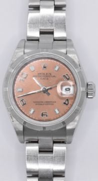 A ladies Rolex Oyster perpetual superlative chronometer wrist watch having a rose gold dial with date aperture to three with alternate luminous and Arabic numerals to the dial, having a milled bezel and stainless steel bracelet strap. Complete in original box with paperwork. No. 79190. Face measures 1.9cm diameter.
