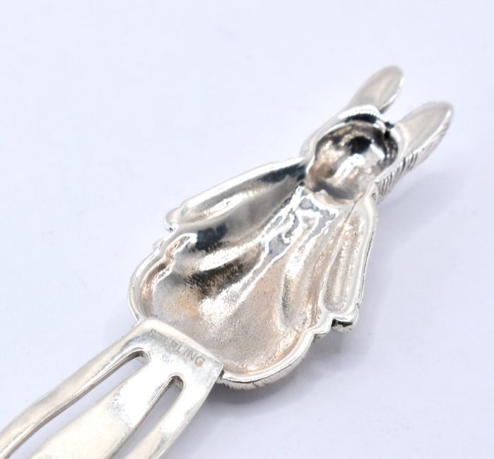 A stamped sterling silver bookmark in the form of Beatrix Potters Peter Rabbit. Measures 75mm long. Total weight 7.63g.