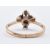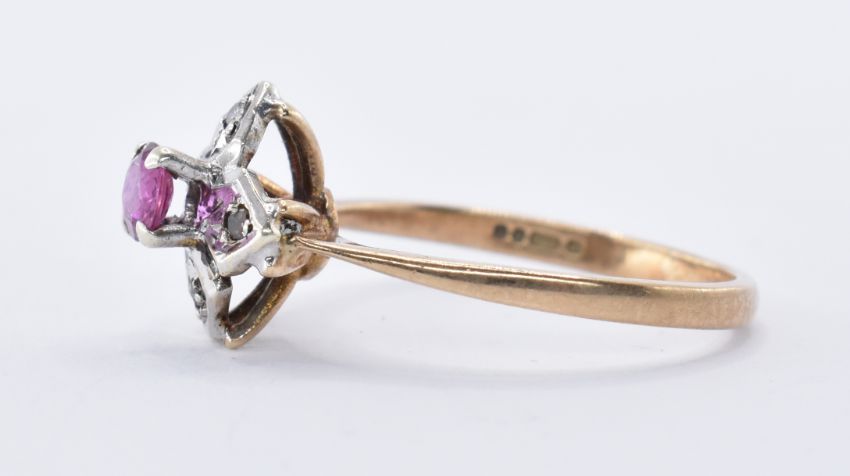 A hallmarked 9ct gold ring set with a round cut ruby to the centre set with four diamonds in marquise shaped white metal mounts. Hallmarked London 1977. Weight 1.7g. Size K.