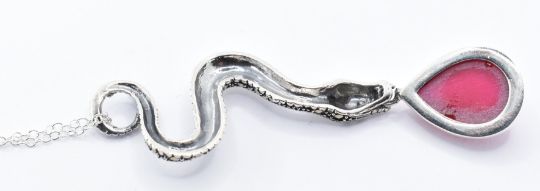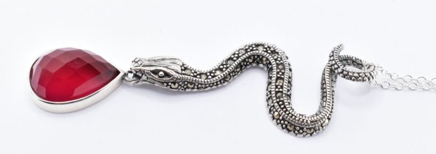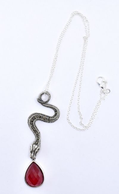 A stamped 925 silver chain necklace with a snake pendant being set with marcasite's and having a faceted red stone drop at the snakes mouth. Stamped to the pendant and the chain. Chain measures approximately 44cm in length and drop measures total 7cm in length. Total weight 13.67g.