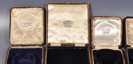 A group of vintage jewellery boxes to include a selection of mostly tooled leather examples, jewellers to include S R Taylor & Co Regent Street, R Richardson, C C Allen, Spink & Son, James Walker, Ben Harral, T & J Perry etc.