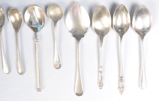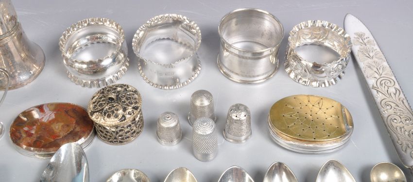 A collection of silver and silver plated items to include a hallmarked silver spoon, hallmarked twin handles cup, hallmarked pepperette, hallmarked napkin ring, silver handled shoe horn, Victorian silver collared button hook with ebony handle, an agate vinigrette (AF), various mixed silver plate items etc.